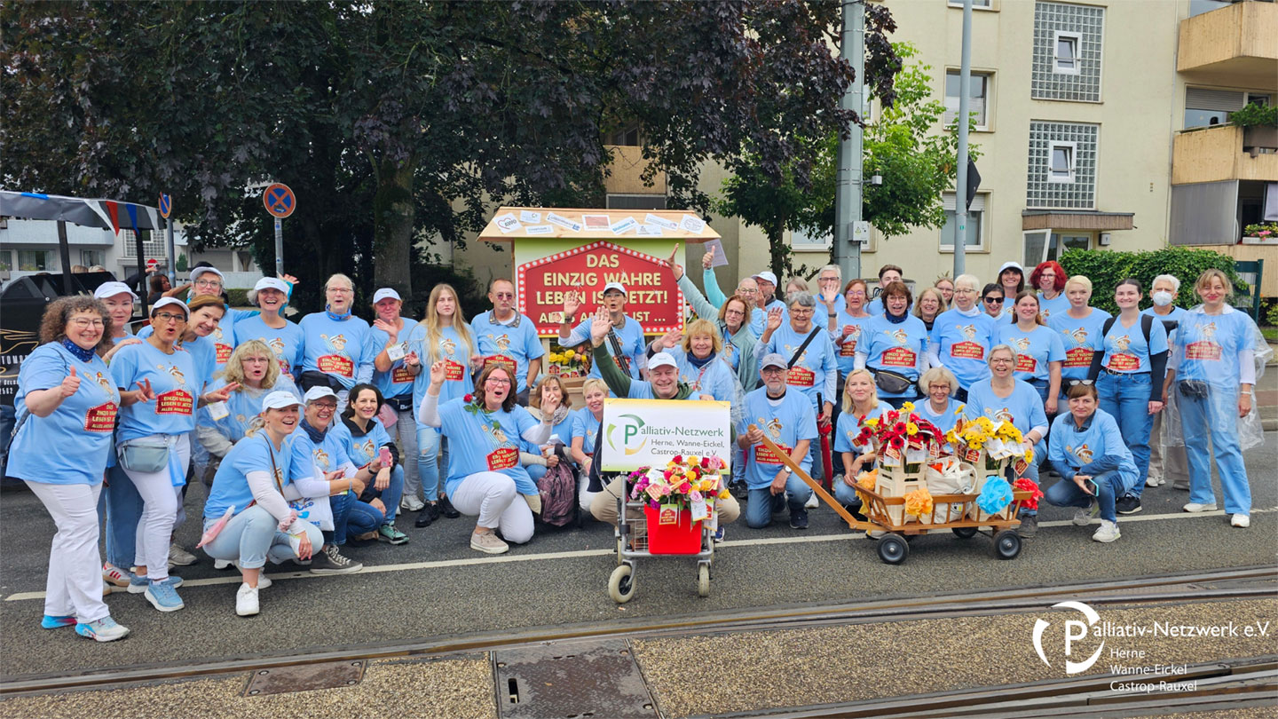 45 strahlende Gesichter, hellblaue T-Shirts, bunte Blumen und unser Motto "Das einzig wahre Leben ist jetzt" – der erste Auftritt des Palliativ-Netzwerkes Herne, Wanne-Eickel, Castrop-Rauxel beim Cranger Kirmes-Umzug war ein voller Erfolg!